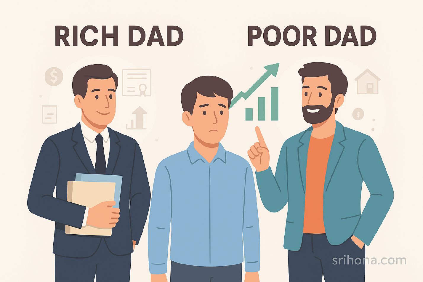 Robert Kiyosaki grew up influenced by two very different father figures. His biological father, whom he calls Poor Dad, believed in job security, stable income, and traditional education. He was well-educated, hardworking, and respected—but struggled financially.